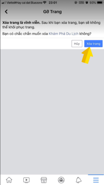 Bước 6: Sau khi bạn ấn vào nút Xóa trang, Facebook sẽ gửi đến bạn thông báo Trang của bạn đã bị xóa vĩnh viễn, bạn ấn vào Ok. Như vậy là việc xóa trang Fanpage Facebook trên điện thoại thành công rồi nhé.